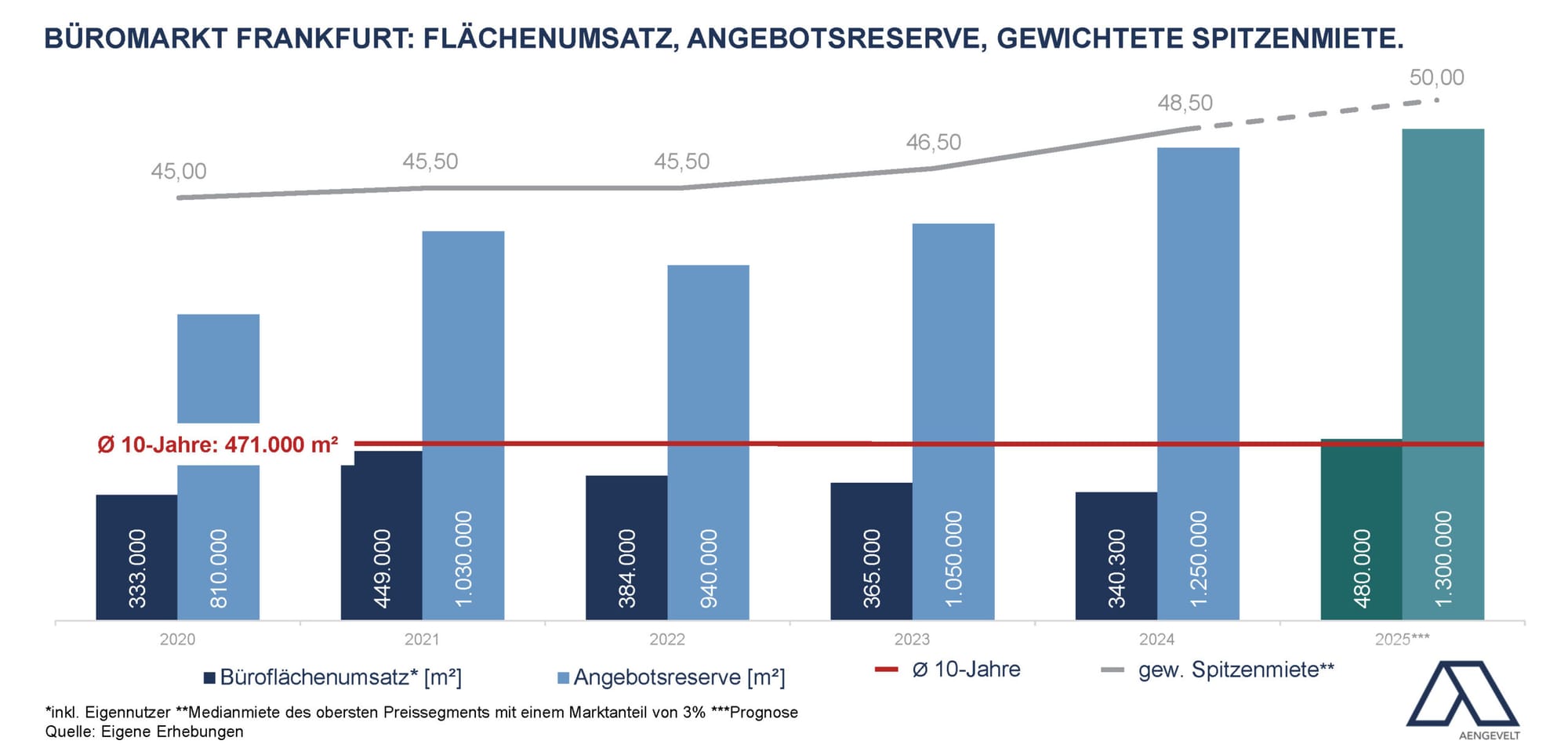 In contrast, Frankfurt’s office market has staged an unexpectedly strong comeback, led by a wave of major leases in the financial sector. Aengevelt reports that while 2024 take-up fell 7% year-on-year to 340,000 m², 2025 is poised for a breakout, with forecast take-up of 480,000 m² — the highest in six years and back in line with the ten-year average.