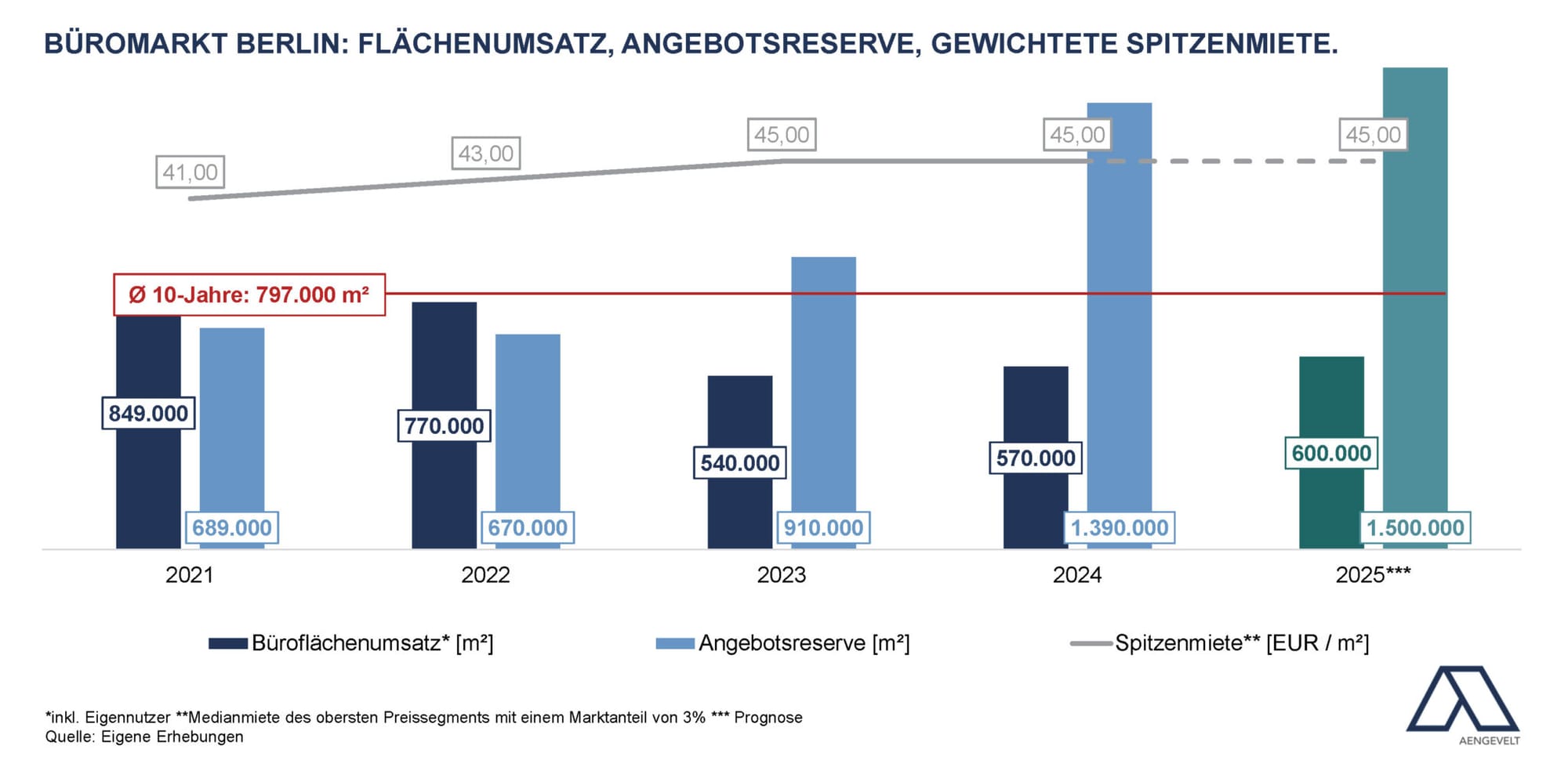 Weighted prime rents have remained stable at around €45/m², according to Aengevelt, placing Berlin behind Munich (€55.70/m²) and Frankfurt (€48.50/m²). However, market forces are building that could reshape this stability.